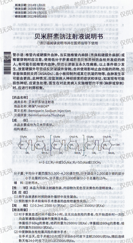 (1)對(duì)于重復(fù)血透時(shí)間不超過4小時(shí),且無出血危險(xiǎn)的患者,在開始透析時(shí)一次性其向血管通路動(dòng)脈端單劑量推注本品。體重低于60kg的患者,給藥劑量為2500IU(抗Xa),體重超過60kg的患者,給藥劑量為3500IU(抗Xa)。